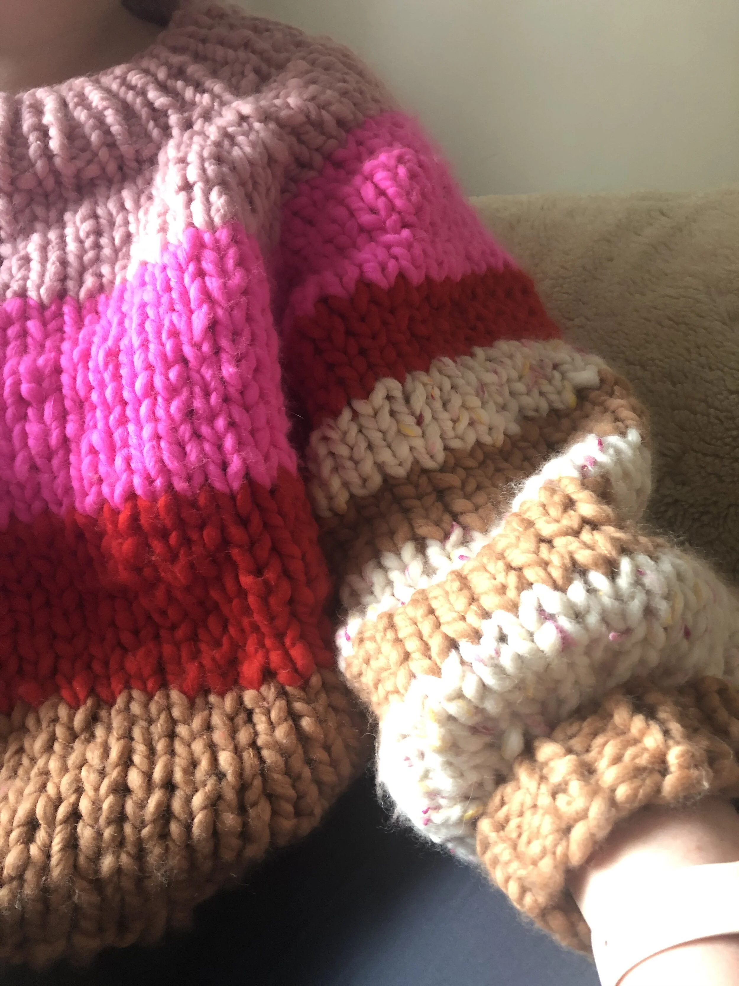 The pattern was really wonderful for a quasi-beginner like me. I have knit maybe once before many years ago. I’m familiar with it but certainly not skilled. My stitches are a little loose for sure, but other than that I found the pattern easy to follow. The hardest part for me was figuring out how to start the underarm.. I had such a mental block that I couldn’t understand for a while. My least favorite part was doing a sewn bind off for the hem. I tried Jeny's surprisingly stretchy bind off for the cuffs and much preferred that method. My favorite part was the repetitive meditation of knitting… and squishing the yarn with my hands. :) Shout out to all my instagram friends who gave tips along the way! Y’all are the best. Side note: Internet friends are real friends. Be nice to others because there’s all kinds of awesome people to get to know!